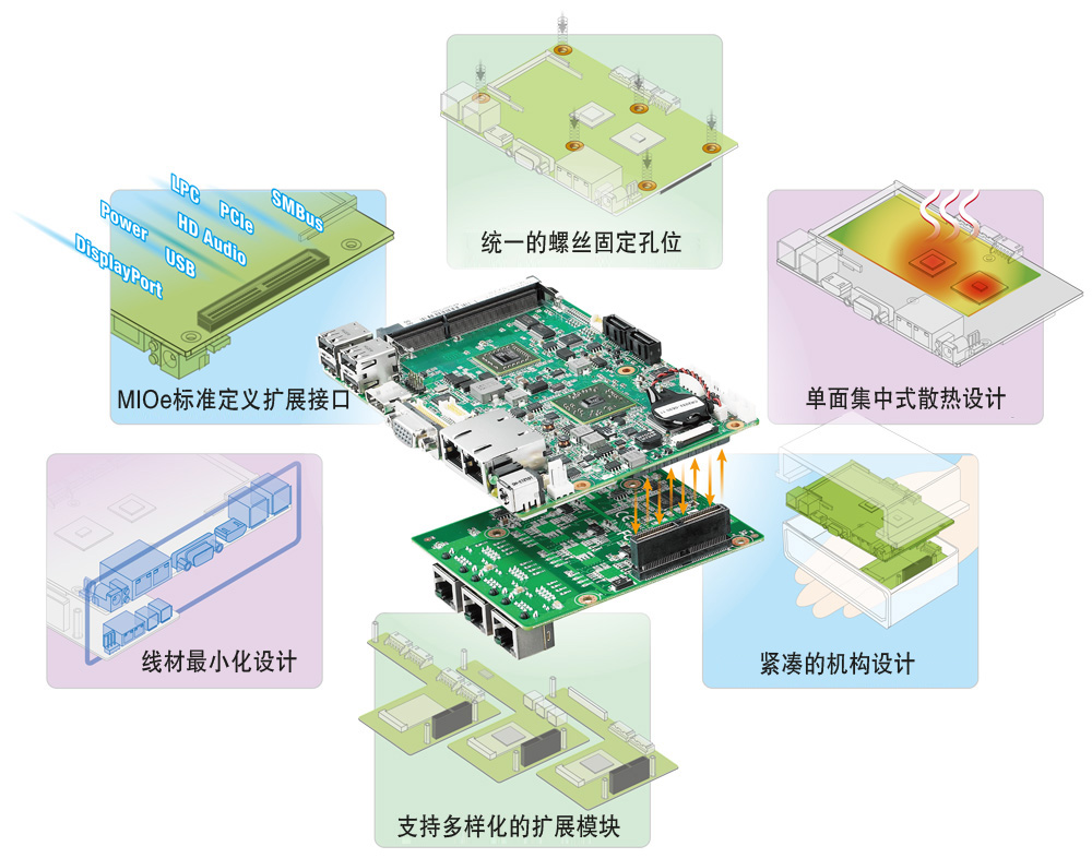 • MI/O Extension系列嵌入式主板都配置了统一的MIOe接口,通过MIOe接口,可扩展出更加灵活的定制化I/O模块。